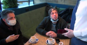 Вот кадры оперативного видео: трое мужчин сидят в кафе, разговаривают, один из них, судя по всему, переводчик.