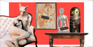 После трона шальной императрицы с отверстием для дилдо экскурсовод — маленькая темноволосая девушка с пирсингом и угольно-черными тенями на веках — подвела нас к экспонату под названием «Рабство» — довольно реалистичного вида кукле-негритянке на четвереньках, испещренной мелким принтом с логотипом Louis Vuitton. Оказалось, правда, что это не принт, а клеймо, потому и рабство. И даже специальные съедобные краски есть для таких клейм — сначала заклеймил, а потом можешь съесть, если захочешь. «Не так ли и мы всякий раз становимся добровольными рабами, соглашаясь на оральный секс?» — обратилась к нам с непростым вопросом девушка-экскурсовод и, не дожидаясь ответа, повела смотреть картины художницы Веры Донской-Хилько, тоже наполненные аллегориями.