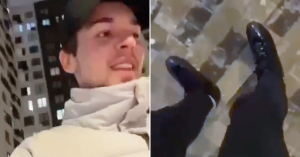 Из-за прошедшего вчера ледяного дождя тротуары в Москве превратились в каток. Один житель Коммунарки воспринял это слишком буквально и решил выйти на улицу в коньках.