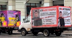 «Ты платишь 1 миллион за новую жену? Она не товарка — она личность!» — сказано на плакате. (Вообще-то «товарка» довольно старый феминитив, но отнюдь не от слова «товар», а от слова «товарищ», например: «Она оглядывала публику и часто здоровалась со знакомыми; это были ее товарки по курсам Герье и по консерватории… » (А. Чехов). Так что лозунг акции выглядит несколько оксюморонно.)