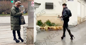 Один шел со стаканом кофе в Басманном районе, его заметил телеграм-канал «Басманный район Москвы М125». Парень изящно и медленно шел по улице, заметно, что он надел каблуки не в первый раз — чувствует себя уверенно.