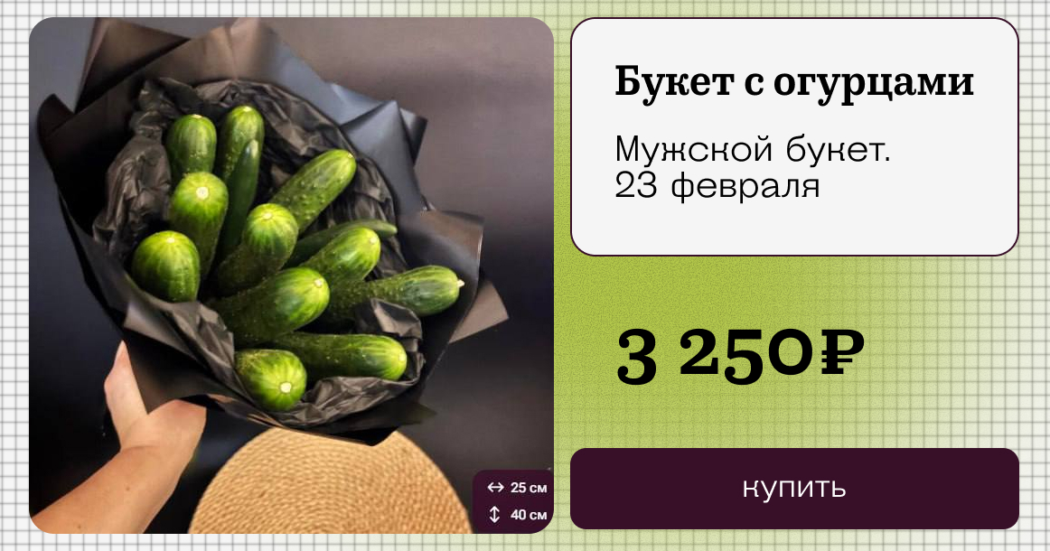 К 23 Февраля в Москве начали активно продвигать «мужские» букеты из огурцов. Выглядит так, что коллективную боль и мем решили аккуратно завернуть в крафтовую упаковку и подать как подарок. Пучок огурцов, обернутый в праздничную упаковку, по фото похож на букет тюльпанов. В описании сухо говорится: «Огурцы, бумажная упаковка, лента». Кто-то прямо в заголовке карточки товара пишет, что это отличный подарок к Мужскому дню.