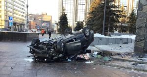 ДТП случилось на пересечении Садового кольца с проспектом Академика Сахарова. Volkswagen Polo, который ехал по внутренней стороне кольца, вылетел на тротуар у подземного перехода, врезался в одну колонну памятника, перевернулся и, задев в полете другую колонну, остался лежать вверх колесами. Обломки разбросало вокруг на несколько метров.