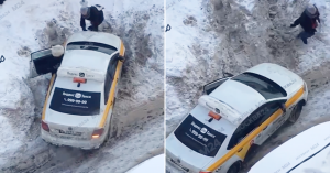 На кадрах видно, что водитель такси уже пытался откопать машину лопатой. А вытолкать автомобиль из сугроба помогла пассажирка такси: она решительно убрала свой шопер за спину и начала толкать машину спереди. Несколько мощных толчков, помощь прохожего — машина поддается, и можно ехать. Надеемся, таксист поставил пассажирке пять баллов в приложении.