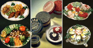 На новогоднем столе было много холодных закусок: икра зернистая – из расчета 25 г на человека, заливное из осетрины и семга с лимоном — по 50 г, по 150 г мясного ассорти с корнишонами и салата «Столичный», слоеный расстегай.