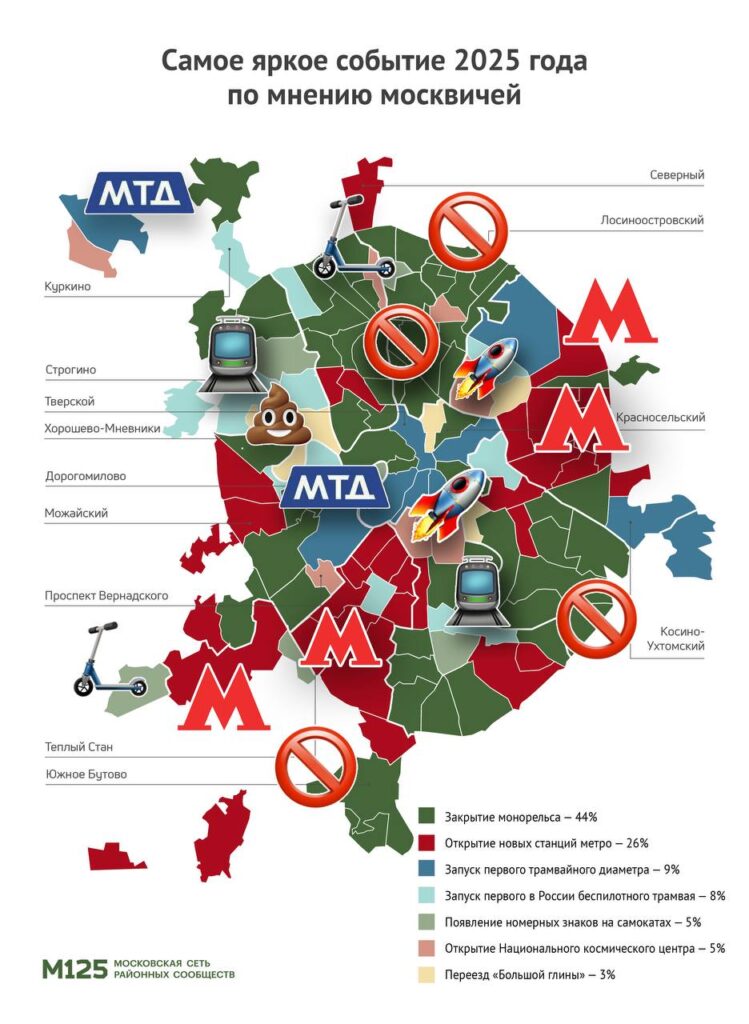 Лидером опроса стало закрытие монорельса, на месте которого теперь делают воздушный парк. Этот пункт выбрали 44% районов Москвы, включая Южное Бутово, Лосиноостровский и Останкинский. Судя по всему, исчезновение привычного по-прежнему самый верный способ войти в историю города.