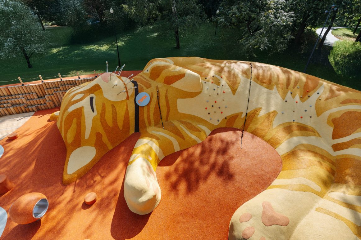 Пространство демонстрирует сразу несколько принципов современного дизайна. Во-первых, это место для детской активности — по коту можно лазить, взбираться по хвосту, канатам, пандусам и зацепам. Во-вторых, это арт-объект: фигура выполнена из особого сорта бетона с резиновой поверхностью, имитирующей кошачью шерсть.