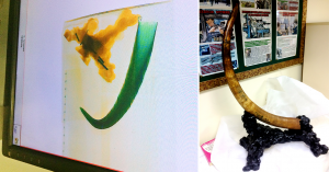 Помните у Высоцкого про досмотр в аэропорту: «Они к нам ездят неспроста — задумайтесь об этом! И возят нашего Христа на встречу с Магометом!» Но на сей раз в багаже оказался не триптих, как в песне, и не старинная икона, а метровый кусок бивня шерстистого мамонта на лакированной деревянной подставке.