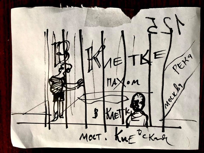Сегодня утром возле Киевского вокзала — на мосту Богдана Хмельницкого — прохожие увидели сидящего в клетке художника: он — в шортах, в панаме и в темных очках, а интерьер клетки обставлен пальмами. Пахом машет табличками «Я Пахом», «Последний герой» и кричит «Хлеба давай». Будет сидеть там часов до шести вечера без еды, воды и теплой одежды и все это время просить о помощи, пишет телеграм-канал Mash, заснявший художника на видео.
