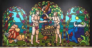 На фреске изображены человек, чем-то похожий на Дональда Трампа, и дама с тележкой из супермаркета, наполненной яблоками (невольно здесь вспоминается леди Супермаркет из песни King Crimson, в которой тоже высмеивается потребление: «Lady Supermarket with an apple in her basket… »). Оба персонажа стоят обнаженные у дерева, с ветки которого свисает дитя-змий, протягивающий плод женщине. С двух сторон — синий бык и огнегривый лев.