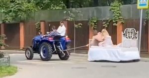 И это Москва: утром на Соколе полуголая пара ехала на кровати, прицепленной к трактору
