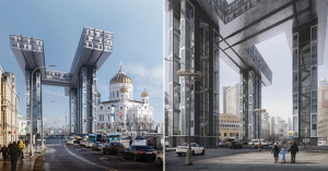 Иллюстратор Константин Анохин решил показать, как выглядели бы авангардные небоскребы, если были бы построены — это его дипломная работа в венецианском университете IUAV. Он фотографировал места, где Лисицкий хотел видеть свои проекты, старательно выбирая наиболее выразительные снимки, а потом накладывал на них воссозданные по чертежам трехногие небоскребы.
