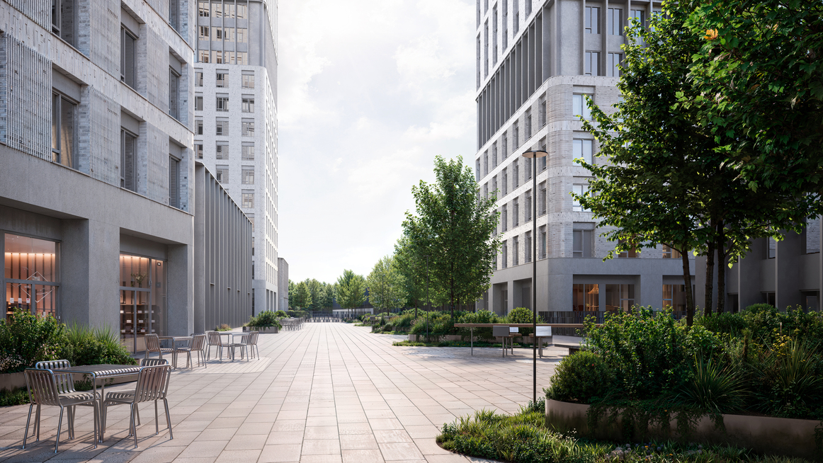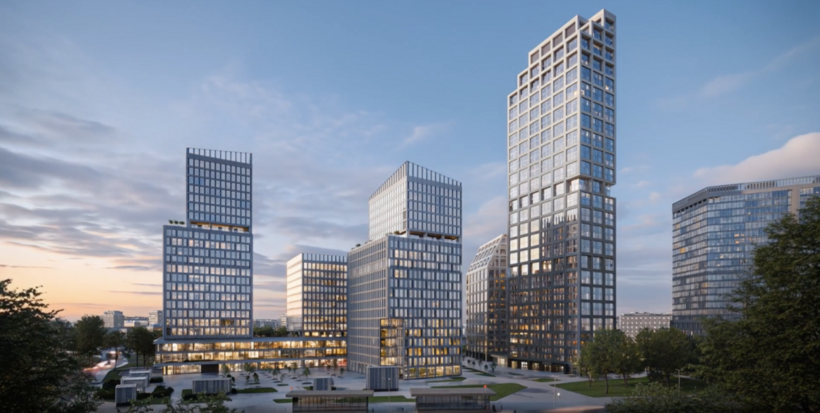 STONE Grain — самый амбициозный по высоте из трех проектов: два корпуса, 45 и 20 этажей. Главная башня взмывает на 165 метров, завершаясь выразительной ступенчатой крышей, которая делает силуэт узнаваемым на фоне застройки юго-запада столицы. Архитектура от бюро Kleinewelt Аrchitekten сдержанная, но полная достоинства: вертикальные акценты фасада, графичная игра света и тени.