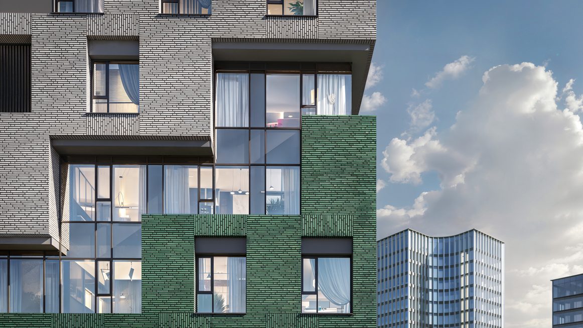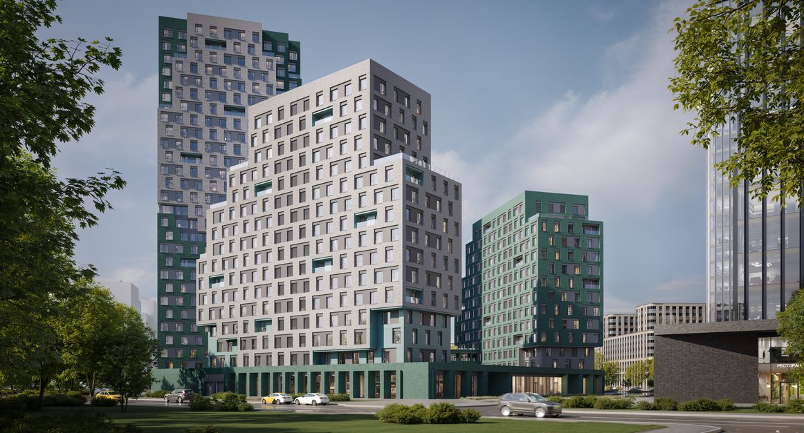 Так, STONE Rise от бюро Wall — архитектурный ансамбль из разноуровневых жилых корпусов с ритмичными фасадами в изумрудных и серых оттенках. За счет пластики фасадов в проекте появились балконы и террасы — архитектурный штрих, придающий комплексу характер и узнаваемость наряду с этажностью и цветовым решением корпусов. Здания гармонично вписаны в ритм города, передавая ощущение энергии, свободы и уюта жизни в мегаполисе. Единый стилобат придает концепции монументальность и формирует камерный закрытый двор. Несмотря на относительно низкую застройку для столицы, в облике проекта также присутствует архитектурная доминанта — башня в 28 этажей. Особым акцентом становится витражный пояс, разделяющий здание на два объема: он создает эффект невесомости верхней части над нижней и усиливает «игру» фасада.