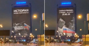 Видео, на котором запечатлен один из билбордов в Москве, опубликовало издание «Новые известия». На медиафасаде здания Гидропроекта на «Соколе», где логотип Samsung, после рекламы корейских телефонов появляется видео с военными, танками, котиками и надписью: «История всегда повторяется. Сила в правде, а правда — за нами».