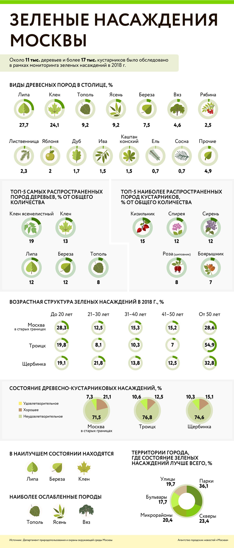 Так, с приятным покончили, а теперь поговорим про тревожное. Внизу картинки есть маленькие диаграммы, из которых следует, что 71,5% московских древесно-кустарниковых насаждений находятся в неудовлетворительном состоянии, 21,1% — в хорошем и еще 7,3% — в пограничном «удовлетворительном». Природа — наша мать, давайте ее беречь и биться за каждое дерево, а то будет у нас, как в центре Санкт-Петербурга, где один сплошной каменный мешок, пусть даже и с очень красивым архитектурным оформлением.