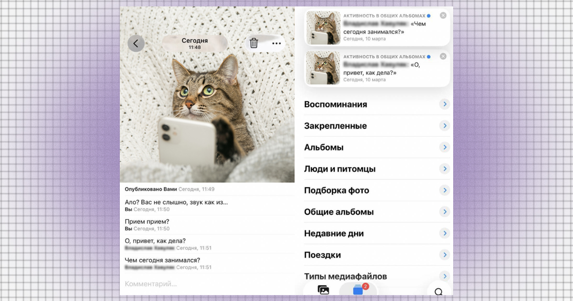 Схема неожиданно рабочая. Один человек создает общий альбом, добавляет туда друзей из контактов, загружает любую картинку — и под ней начинается полноценная переписка. Корреспондент «Москвич Mag» убедился: все комментарии доходят моментально.
