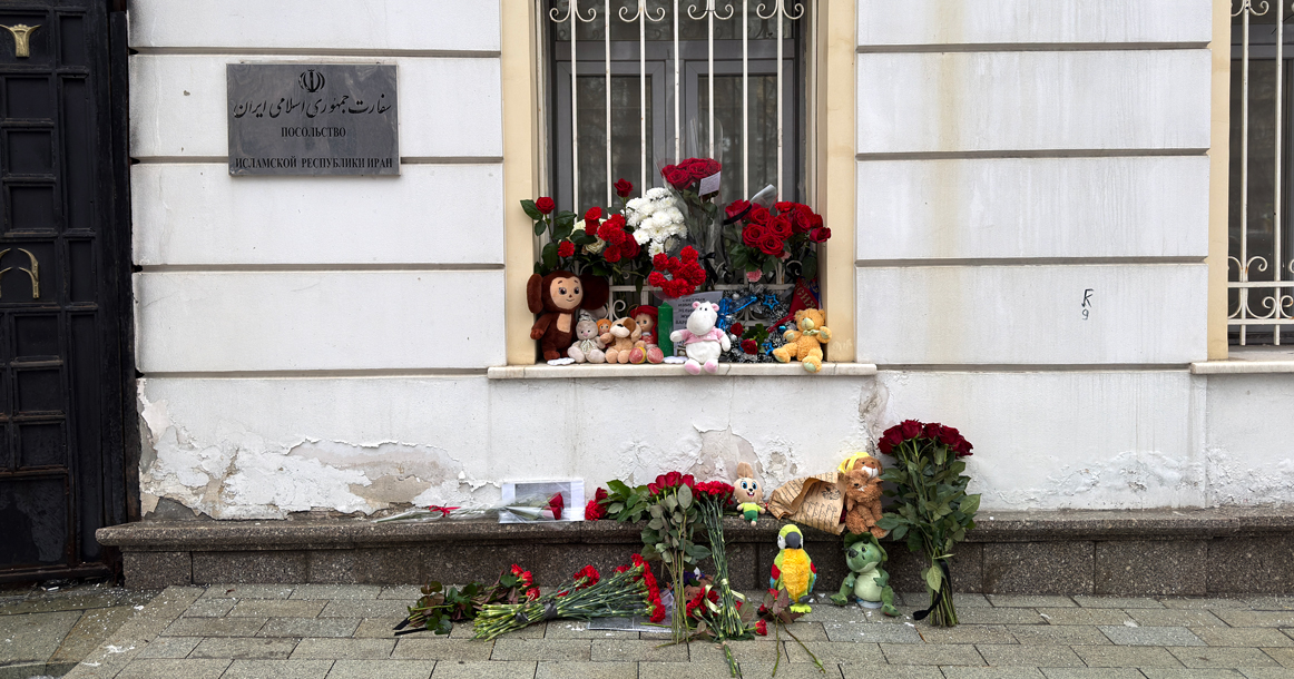 Стихийный мемориал образовался прямо у входа в здание дипмиссии рядом с табличкой «Посольство Исламской Республики Иран»: москвичи несут туда цветы, детские игрушки, свечи.