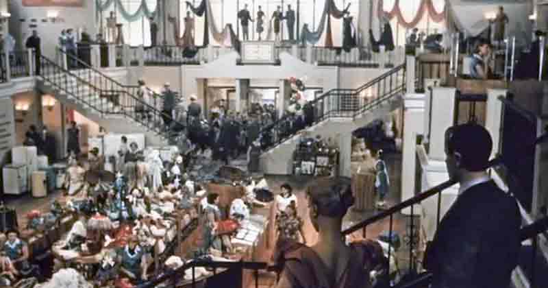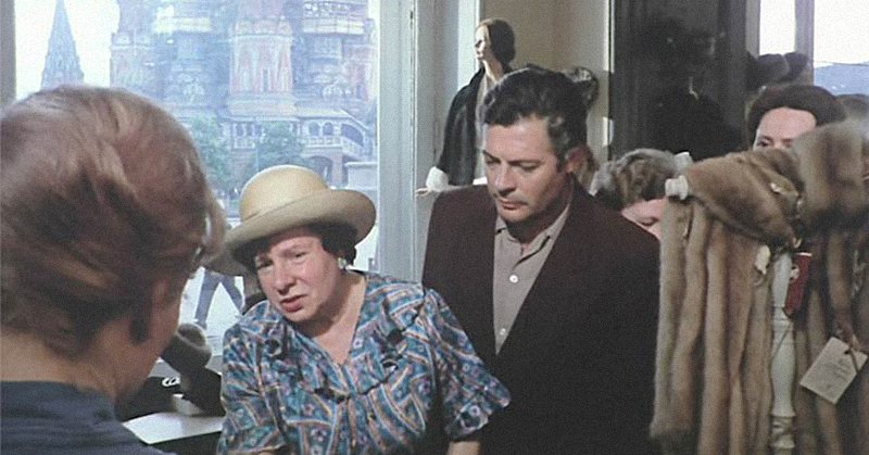 Начнем с картины поразительной судьбы. Сценарий написал Алексей Каплер, только вернувшийся из ссылки, куда попал за роман со сталинской дочкой Светланой Аллилуевой. Сегодня написанная им лирическая комедия о сотрудниках безымянного универмага смотрится как фильм, по степени язвительности приближающийся к произведениям братьев Коэн. В центре сюжета — конфликт завотделом готового платья Михаила Крылова (Иван Дмитриев) и директора швейной фабрики «Заря» Анны Андреевой. Стычка из-за поставляемой в магазин бракованной одежды оборачивается романом, а фоном для романтического сюжета становится мошенничество, в котором несправедливо обвиняют Крылова. У вас уже возник резонный вопрос, причем же здесь ГУМ? Отвечаем: консультантом на съемках выступал директор магазина Иван Строгов, а в качестве реквизита на прилавках отстроенного в павильоне универмага лежал настоящий гумовский дефицит.