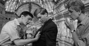 Начнем с картины поразительной судьбы. Сценарий написал Алексей Каплер, только вернувшийся из ссылки, куда попал за роман со сталинской дочкой Светланой Аллилуевой. Сегодня написанная им лирическая комедия о сотрудниках безымянного универмага смотрится как фильм, по степени язвительности приближающийся к произведениям братьев Коэн. В центре сюжета — конфликт завотделом готового платья Михаила Крылова (Иван Дмитриев) и директора швейной фабрики «Заря» Анны Андреевой. Стычка из-за поставляемой в магазин бракованной одежды оборачивается романом, а фоном для романтического сюжета становится мошенничество, в котором несправедливо обвиняют Крылова. У вас уже возник резонный вопрос, причем же здесь ГУМ? Отвечаем: консультантом на съемках выступал директор магазина Иван Строгов, а в качестве реквизита на прилавках отстроенного в павильоне универмага лежал настоящий гумовский дефицит.