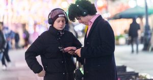 «Рок-Тверская» напоминает про это открытие стартовой точкой — двором Булгаковского дома. Там, возле подъезда «нехорошей квартиры», формировалось движение советских хиппи. С этой истории начинают спектакль главные герои и ваши провожатые — Михаил Козырев и Муся Тотибадзе. Тотибадзе называет Козырева крестным папой русского рока, он ее — иконой нового поколения. С первых же минут становится ясно: кастинг для задачи — рассказать об истории русского рока в декорациях реальной Москвы — идеален. Смех и редкие подпевания Муси миксуются с сигналящими в пробках машинами и не по-сентябрьски гудящим вечером. От голоса Козырева память сама собой достраивает другую Тверскую — в рекламе, с проводами между домами и студией радио «Максимум» там, где сейчас отель «Стандарт».