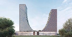 По задумке авторов, композиция двух корпусов должна иметь характерный U-образный изгиб, а внизу, у стилобата с панорамными окнами, планируют разбить зеленый и общедоступный дворик с амфитеатром.