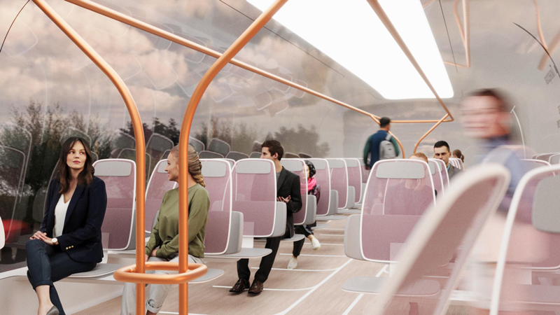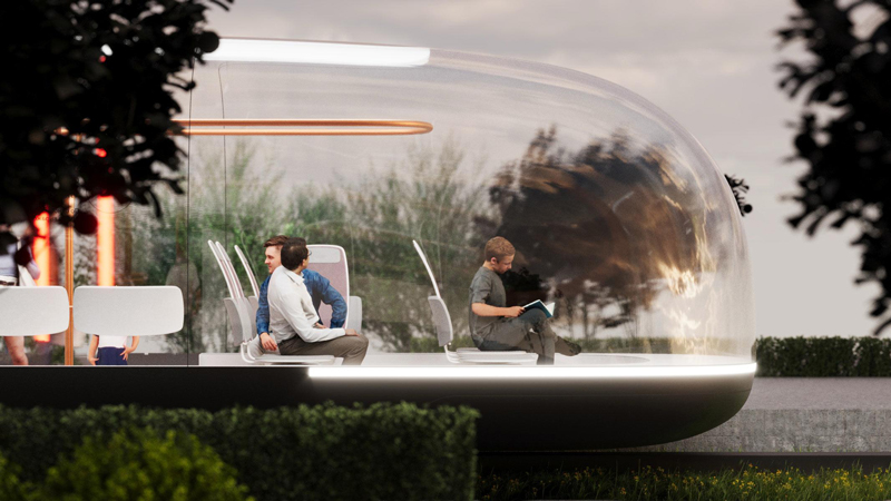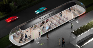 Водитель, говорят, не нужен — транспорт беспилотный. Сиденья тоже нестандартные: они регулируются по высоте под рост пассажира, могут поворачиваться друг к другу (чтобы компания сидела лицом к лицу) и умеют подогреваться зимой и охлаждаться летом. Остановки объявляют не на весь салон, а каждому отдельно: звук идет из излучателей прямо в подголовнике (жуть).
