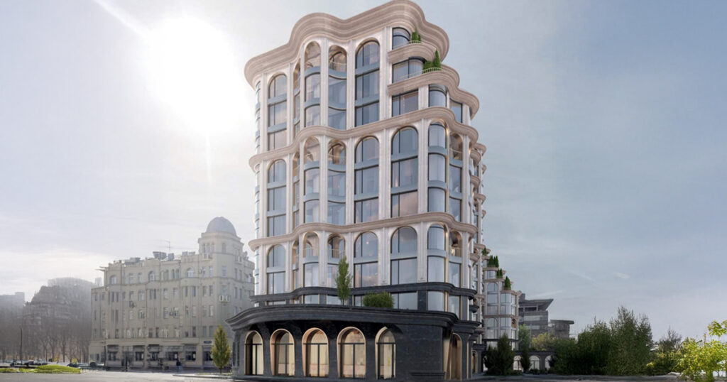 Но, судя по всему, сценарий будет несколько другим. На днях канал «Недвижимость инсайды» опубликовал любопытный рендер, который всплыл в публичном поле. Кто его авторы, неизвестно, но сам проект выглядит как привет из нулевых: волнистые фасады, обилие арок, много стекла с мягкими изгибами — типичный лужковский стиль. Есть ощущение, что визуализация вообще могла быть сгенерирована с помощью ИИ.