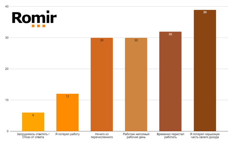 И все это только за время мер по предотвращению распространения коронавируса. Самое ужасное, конечно, что среди оставшихся без работы больше всего людей 45–50 лет — 16% в своей группе; это как раз те, кому в их возрасте приходится кормить и подросших детей, и пожилых родителей. А вот у более молодых людей — от 35 до 44 лет — серьезно упали доходы у каждого второго: 47% от всех представителей своей группы среди опрошенных.