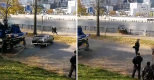 Дептранс сообщил, что на набережной Тараса Шевченко автомобиль вылетел в реку из-за того, что водитель не справился с управлением. Но позже появилось видео, в котором отчетливо заметно, что произошла не авария, а творилось искусство — автомобиль двинулся навстречу стихии (и двум «пешеходам») под присмотром множества объективов, снимавших новый фильм или сериал.