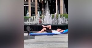 У бизнес-центра «Белая площадь» на «Белорусской» заметили мужчину, принимающего солнечные ванны на надувном матрасе прямо у фонтана. Он оказался одним из участников флешмоба, который сегодня проходит по всей Москве.