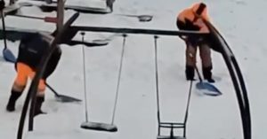 На кадрах видно, как двое уборщиков с лопатами ходят по площадке, где детские качели соседствуют с кучей спортивных тренажеров, и тщательно разглаживают поверхность. Рядом стоит еще один дворник и, как водится, наблюдает.