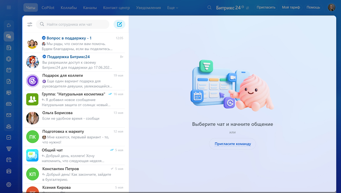 Мессенджер — часть огромной экосистемы, которая включает CRM, таск-менеджер, календарь и базу знаний. Ключевой особенностью является встроенный ИИ-помощник BitrixGPT, который помогает в работе с текстами и звонками.