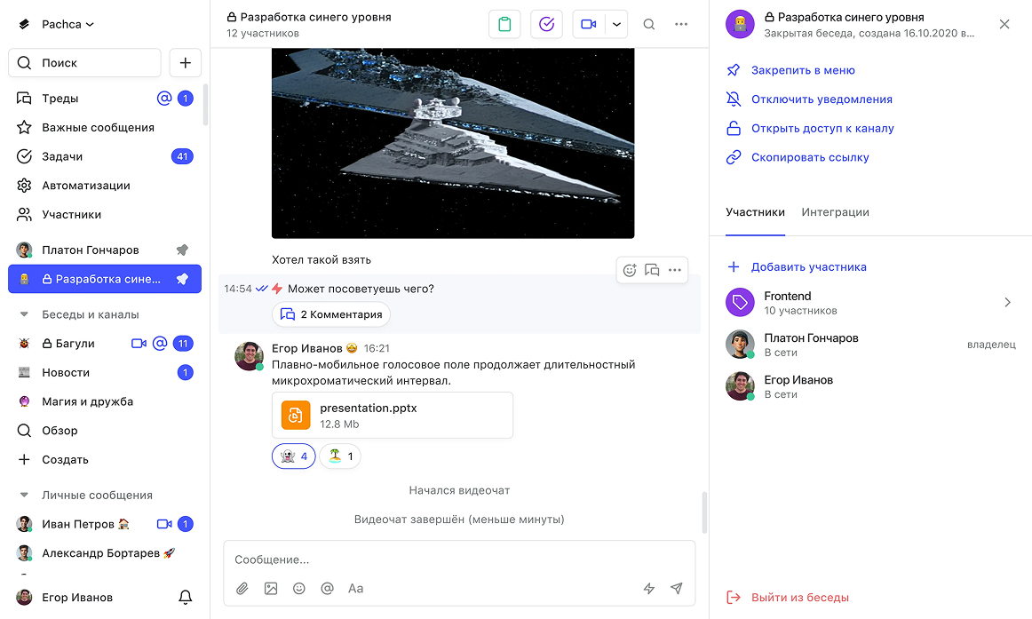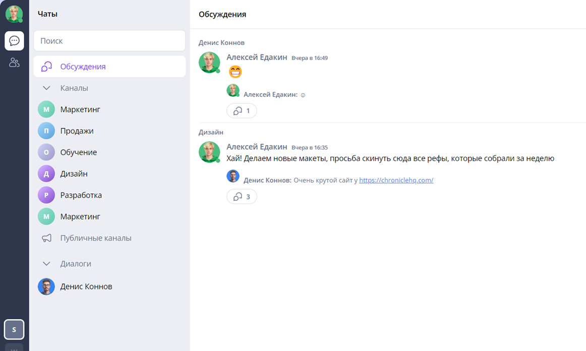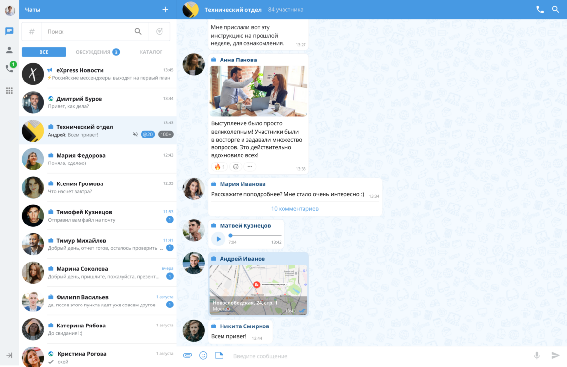 - Чаты, каналы и обсуждения в тредах.