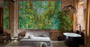 Что же касается стилистики интерьера, то она отсылает нас к лофту. Оголенные кирпичные и бетонные стены, доска на полу, открытая проводка. Кирпичные стены позволяют напомнить о возрасте дома, в котором находится квартира, и придают интерьеру оттенок исторической значимости. Легкая брутальность обстановки разбавлена интересными деталями: например, батареи и трубы отопления выкрашены золотой краской, что выглядит и необычно, и благородно, и отлично сочетается с бронзовой тонировкой зеркальных панелей. Особую роль в этом интерьере играет искусство — картины и инсталляции Карахана Сефербекова. Они экспрессивны и эмоциональны, добавляют пространству глубины, многоплановости и энергии.