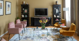 Санузел из бежевого стал синим. В гостиной главной доминантой стали ковер и винтажные итальянские кресла 1970-х годов, все остальное сложилось вокруг них, а горчичный цвет стен собирает все элементы в единую композицию. В столовой мы лишь поменяли старую ткань на новую с графическим рисунком», — описывает свою работу Наталья.