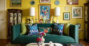 Гостиной яркие моменты в интерьере не ограничиваются — спальня в квартире тоже цветная, стены оклеены нежно-зелеными обоями с орнаментом из цветов и птиц. Интерьер наполнен множеством приятных аксессуаров — вазами, статуэтками, подушками, лампами с необычными абажурами. И из-за этого совершенно новый интерьер воспринимается как «квартира с историей», с ощущением насыщенной жизни. И так всегда и бывает, когда интерьер строится вокруг личности человека, который в нем живет.