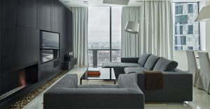 Как ни удивительно, владелец этой квартиры — человек немолодой. Он всегда предпочитал классические интерьеры, но то, что ему предлагали в этот раз разные дизайнеры, ему почему-то не нравилось. После встречи с Za bor все изменилось: первые же 3D-эскизы задали новое направление работы. Определившись с радикально современным стилем, клиент показал, что знает, чего хочет: например, он заранее выбрал некоторые отделочные материалы. Были и функциональные «обязательные пункты»: наличие библиотеки, хорошие системы хранения, кабинет (в темных тонах с кожаным столом и диваном) и биокамин.