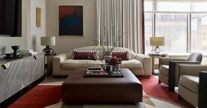 Еще одна заметная черта гостиной — широкие подоконники, которые работают как скамьи: «В гостиной огромные окна и роскошный вид на “Сити”, нужно было обязательно создать места, где можно с комфортом этими видами любоваться».