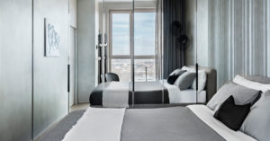 Как это часто бывает в московских новостройках, квартира продавалась без определенной планировки — обозначено было только место для «мокрой зоны». Дарья, мечтавшая о покое, с самого начала спланировала для себя изолированную спальню с совмещенной функцией кабинета. В стену напротив окна встроен шкаф: в двух секциях хранится одежда, а еще в одной спрятано рабочее место.