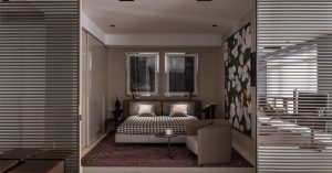 Спальня вышла необычная: в ней как раз окон нет, она похожа на глубокую нишу и отделена от гостиной раздвижными дверями с зеркальными полосками. Камерная и уютная, спальня напоминает шкатулку для хранения драгоценностей, и для полноты картины ее стены обиты замшей. Ванная тоже впечатляющая — она вся облицована камнем и оснащена ультрасовременным оборудованием.