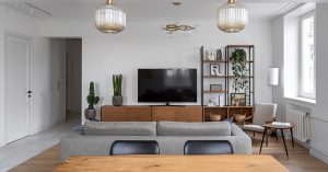 На начальных этапах работы была идея выделить помещение под кабинет/гостевую спальню. «Но в процессе ремонтных работ, когда снесли стены, клиентам так понравилось ощущение простора, что решили отказаться от кабинета и объединить кухню с гостиной», — вспоминает Лина Князева.