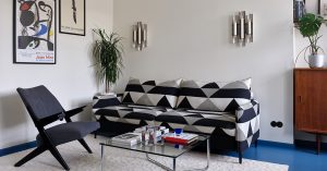 Одно из окон — кухонное — выходит прямо на Шуховскую башню. Но в декоре и обстановке ассоциациями со знаменитой постройкой злоупотреблять не стали — разве что рисунок черно-белого дивана в зоне гостиной немного похож на решетку башни. В подборе мебели и светильников вообще не стали впадать в крайности — светильники, например, нашли винтажные советские. А мебель подобрали разную — и современную в популярном стиле mid century («середины века»), и европейский винтаж, и новые изделия. Многие из них сделаны по эскизам Марии Пилипенко.