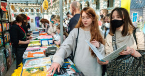 «Гостиный двор», где проходит книжная ярмарка non/fictio№22, сквозь стеклянный потолок заливает ярким солнечным светом, люди гуляют вдоль книжных стендов. Мужчина с длинной бородой начинает громко чихать, но на удивление никто не отбегает от него в стороны, буднично желают быть здоровым. Солнце светит так, будто уже полноценная весна, а люди ведут себя словно эпидемии больше не существует. Хотя ни то ни другое пока не совсем правда, на улице еще морозно, а на входе просят надеть маску.