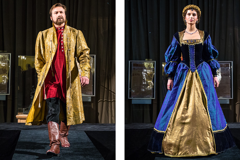 Боярские шубы из «Бориса Годунова» или костюм шута из «Царя Иоанна Грозного» на показе можно было увидеть отдельно от самих постановок.
