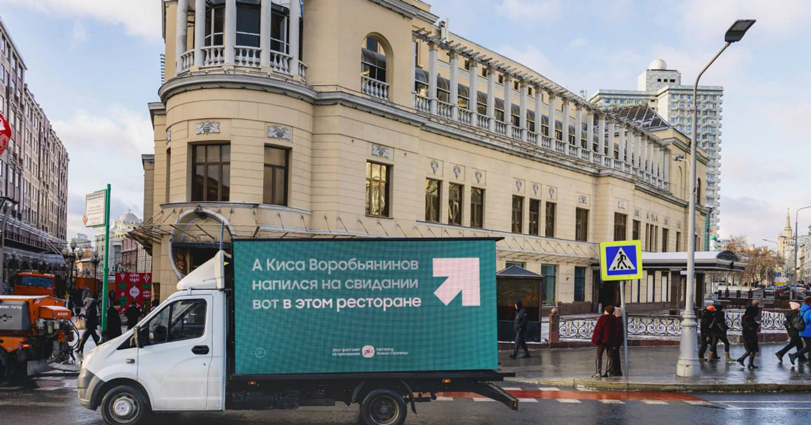 Например, таким, как на фото: «А Киса Воробьянинов напился на свидании вот в этом ресторане». Газелька с LED-экраном стоит у двухэтажного дома-утюга у слияния Старого и Нового Арбата.