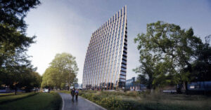 На рендерах можно разглядеть, что эта конструкция необычно сильно сужается кверху. Выходит что-то типа дома-утюга, но только не когда им гладят, а когда он стоит на гладильной доске.