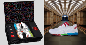 Итак, перед нами результат коллаборации знаменитого японского бренда Asics и знаменитой русской студии дизайна, которая делает в нашем городе примерно все. А в метро — так просто все, включая схему и навигацию. Схемой вроде бы все пользуются, хотя мелковата; с навигацией отчетливо мучаются и москвичи, и особенно иногородние и иностранцы. Кроссовки, кажется, находятся между ними — в качестве обуви неплохо, в качестве образца пусть и тематического, но дизайна довольно странно. Например, несколько буквальное использование цветов линий в оформлении обуви.