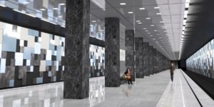 Кстати, уже готов и проект самой станции — и выглядит она как-то по-северному мрачновато. В оформлении преобладают холодные цвета — голубой, серый, а также черный, на потолке — алюминиевые пластины с перфорацией. Этот проект пока не утвержден — будем надеяться, что дизайнеры и архитекторы успеют создать какие-то альтернативы.