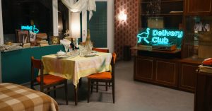 Вместе с Delivery Club они предлагают отпраздновать в ней Новый год. И хотя сама по себе квартира Нади Шевелевой не настоящая (оригинал расположен в доме 119 на проспекте Вернадского), а построена с нуля в павильоне «Мосфильма», восстановлены мельчайшие детали и использован настоящий реквизит со съемок. Например, в ней можно найти шубу Ипполита, а также платье и гитару Нади. Правда, развешенные в каждой кнопке светящиеся логотипы Delivery Club атмосферу все-таки немного портят — могли бы сделать их хотя бы стилизованными под то время, например нарисовать красками на оргалите.